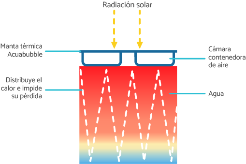• Nuestras mantas térmicas Acuabubble consiguen mejorar la retención del calor de agua. De forma paralela, al cubrir la superficie libre del agua de la piscina, se reduce el efecto de la convección entre el agua y el aire, disminuyendo el flujo de calor al ambiente.