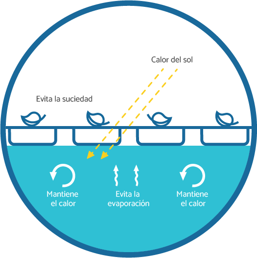 Durante las horas de radiación solar, la manta térmica para piscinas se calienta y cede calor a la piscina, minimizando las pérdidas de calor. Durante la noche, actúa como un aislante térmico disminuyendo las pérdidas de calor.
